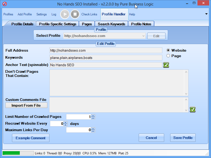 Here you can handle everything with your profile including the anchor texts for your inner pages, how often to check for new pages, comment to be posted and so much more.